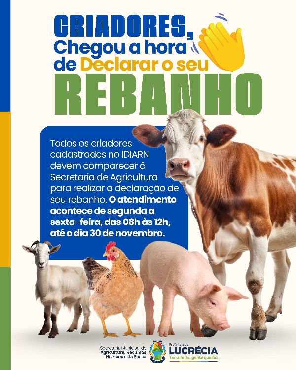 A Prefeitura Municipal de Lucrécia, por meio da Secretaria de Agricultura, Recursos Hídricos e da Pesca, informa que já está aberto o período de declaração obrigatória de rebanho para todos os criadores cadastrados no IDIARN.