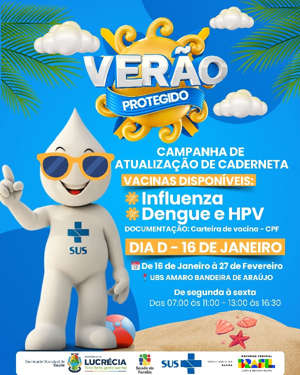 A Prefeitura Municipal de Lucrécia, por meio da Secretaria Municipal de Saúde, deu início à campanha "Verão Protegido", com foco na atualização da caderneta de vacinação da população. A ação acontece no período de 16 de janeiro a 27 de fevereiro, na UBS Amaro Bandeira de Araújo, reforçando o compromisso do município com a prevenção e o cuidado com a saúde pública.