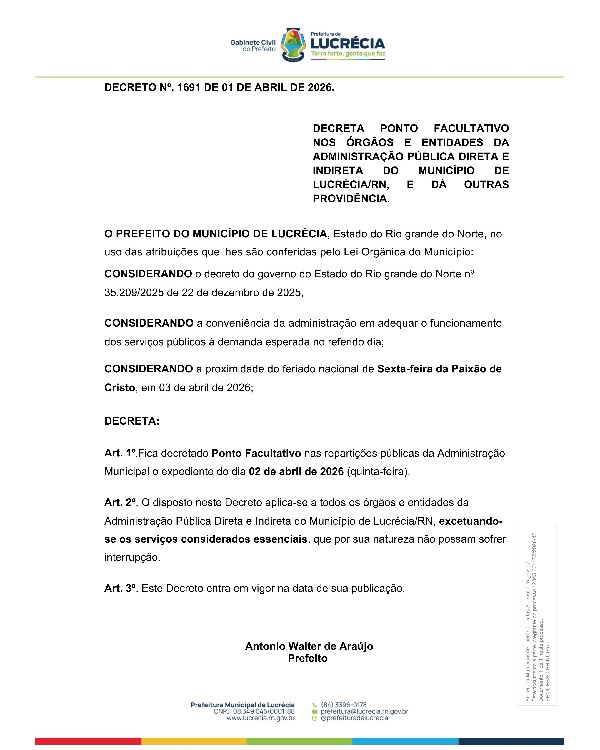 A Lucrécia informa à população que foi decretado Ponto Facultativo no âmbito da Administração Pública Municipal nesta quinta-feira, 02 de abril de 2026.