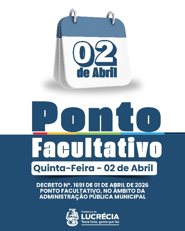 A Lucrécia informa à população que foi decretado Ponto Facultativo no âmbito da Administração Pública Municipal nesta quinta-feira, 02 de abril de 2026.