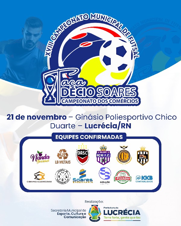 A Prefeitura Municipal de Lucrécia, por meio da Secretaria de Esporte, Cultura e Comunicação, realizará no próximo dia 21 de novembro, no Ginásio Poliesportivo Chico Duarte, a abertura oficial do XVIII Campeonato Municipal de Futsal - Taça Décio Soares (Campeonato dos Comércios).