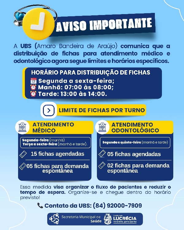 A Prefeitura de Lucrécia, por meio da Secretaria Municipal de Saúde, informa à população que a Unidade Básica de Saúde (UBS) Amaro Bandeira de Araújo adotou novos critérios para a distribuição de fichas de atendimento médico e odontológico.